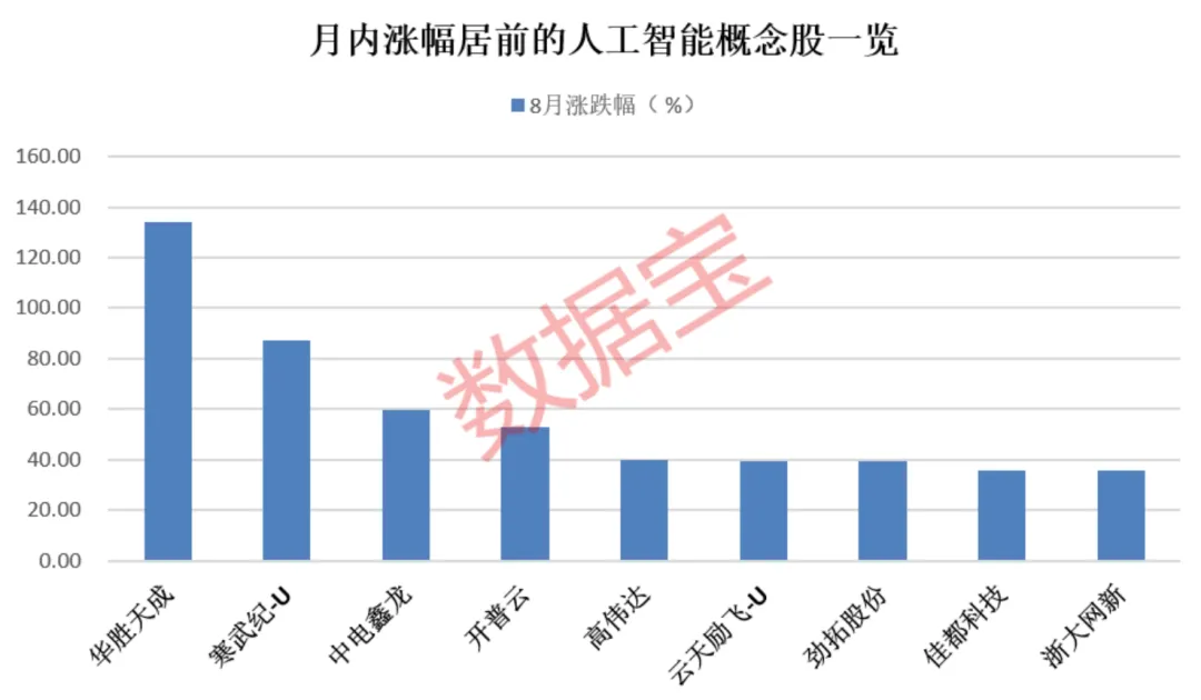 据证券时报·数据宝统计,人工智能概念股8月以来平均上涨16.5%,超九成概念股的股价录得上涨,其中,华胜天成、寒武纪-U、中电鑫龙、开普云月内涨幅均超50%,人工智能投资价值凸显。