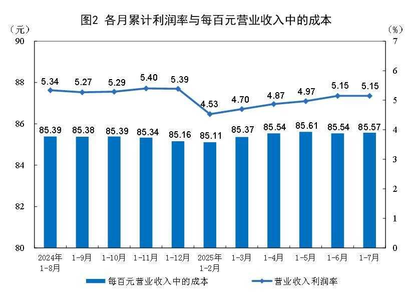 1—7月份,规模以上工业企业每百元营业收入中的成本为85.57元,同比增加0.24元;每百元营业收入中的费用为8.38元,同比减少0.08元。