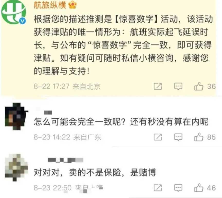 在这些帖子下面有不少评论,有的说“没仔细看就付钱了,才发现是个坑”,“这是在卖彩票吗”,有回复“可以找客服退,但可能排队很久,很坑就是了”。据航旅纵横App官方在社交平台的回复显示,【惊喜数字】活动获得津贴的唯一情形为:航班实际起飞延误时长,与公布的“惊喜数字”完全一致,即可获得津贴。