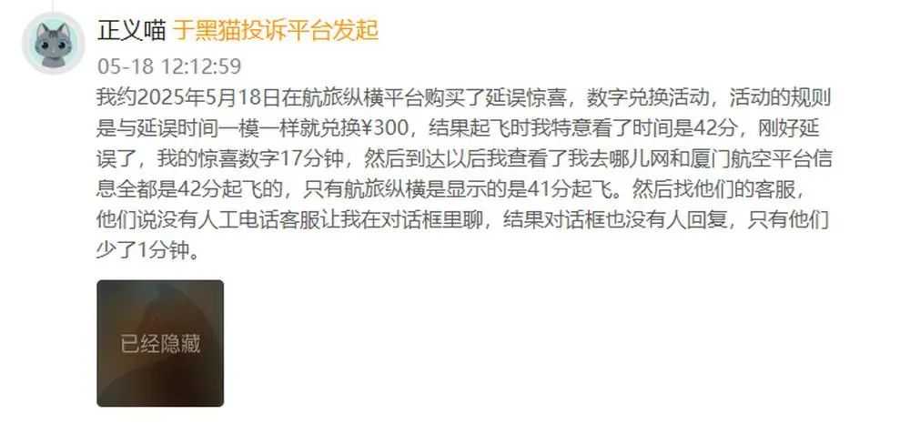 不少消费者吐槽,这样关键信息容易被人忽略,而且一般人会默认延误时长是指超过该数字。据封面新闻,记者注意到,在黑猫投诉平台上,也有网友发布投诉意见称,在航旅纵横平台购买了延误惊喜数字兑换活动,活动的规则是与延误时间一模一样就兑换300元,“结果起飞时我特意看了时间是42分,刚好延误了,我的惊喜数字17分钟,然后到达以后我查看了购票平台和航司信息,全都是42分起飞的,只有航旅纵横是显示的是41分起飞。”这位网友后来联系航旅纵横APP客服,发现航旅纵横APP是少了1分钟,和她的惊喜数字不符,并且和延误时间不符。