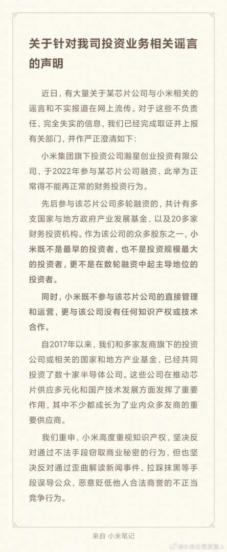 在官方介绍中,尊湃通讯成立一年就完成了总额超3亿人民币的融资。2022年5月,尊湃通讯宣布超募完成数亿人民币Pre-A轮融资,该轮投资由小米集团、湖杉资本、天际资本、嘉御资本、上海科创旗下海望资本、平治信息等知名财务投资机构以及产业投资方组成,资金将主要用于研发投入、投片测试、市场拓展以及公司运营等。此前,尊湃通讯于2021年5月已完成由高榕资本领投,江北佳康科技跟投的近亿人民币天使轮融资。值得注意的是,2023年12月24日晚,小米集团官博发布声明:近日,有大量关于某芯片公司与小米相关的谣言和不实报道在网上流传。对于这些不负责任、完全失实的信息,我们已经完成取证并上报有关部门,并作严正澄清。小米表示,集团旗下投资公司瀚星创业投资有限公司,于2022年参与某芯片公司融资,此举为正常得不能再正常的财务投资行为。先后参与该芯片公司多轮融资的,共计有多支国家与地方政府产业发展基金,以及20多家财务投资机构。小米称,作为该公司的众多股东之一,小米既不是最早的投资者,也不是投资规模最大的投资者,更不是在数轮融资中起主导地位的投资者。小米在声明中表示,小米既不参与该芯片公司的直接管理和运营,更与该公司没有任何知识产权或技术合作。小米高度重视知识产权,坚决反对通过不法手段窃取商业秘密的行为。
