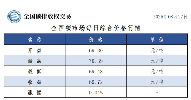 新华财经北京8月27日电据微信公众号“全国碳交易”,今日全国碳市场综合价格行情为: 开盘价69.80元/吨,最高价70.39元/吨,碳市场价格最低价69.48元/吨,收盘价69.72元/吨,收盘价较前一日上涨0.04%,碳市场行情呈现微涨态势。