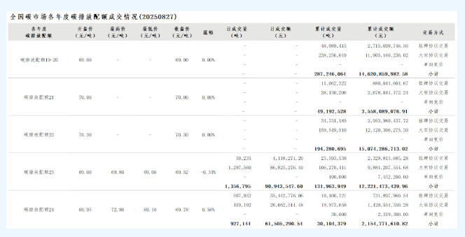 截至2025年8月27日,全国碳市场碳排放配额累计成交量692,787,615吨,累计成交额47,629,480,823.29元,碳市场累计数据再创新高。