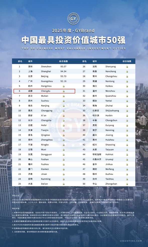 微成都报道8月26日,GYBrand全球品牌研究院权威发布2025年度《中国最具投资价值城市50强指数》,深圳、上海、北京、广州稳居前四,成都投资价值凸显位列全国第六名,成为西部投资热土。