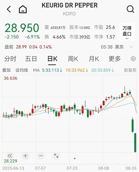 具体来看,KDP将以每股31.85欧元的价格收购JDE Peet's 100%的股权,JDE Peet's的股东仍将获得此前宣布的每股0.36欧元的股息。交易消息一经公布,市场迅速作出反应。JDE Peet's在阿姆斯特丹上市的股价快速飙升。而KDP的股价连续重挫,从此前的35美元/股跌至29美元/股附近。
