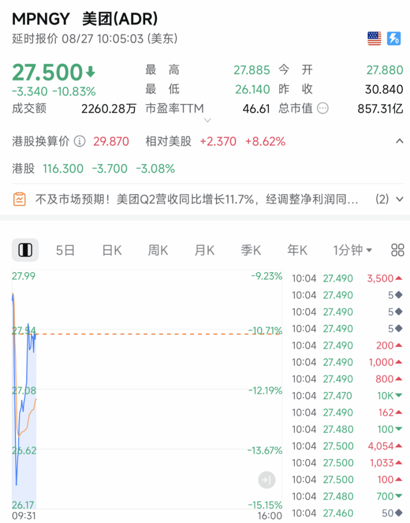 美团最新发布的财报显示,由于外卖行业竞争激烈,美团第二季度营收同比增长11.7%但不及预期,经调整净利润同比大幅下降89%。受此影响,27日晚间,美股开盘后,美团ADR一度大跌超14%,市场竞争影响显著。受此影响,美团股价波动明显。