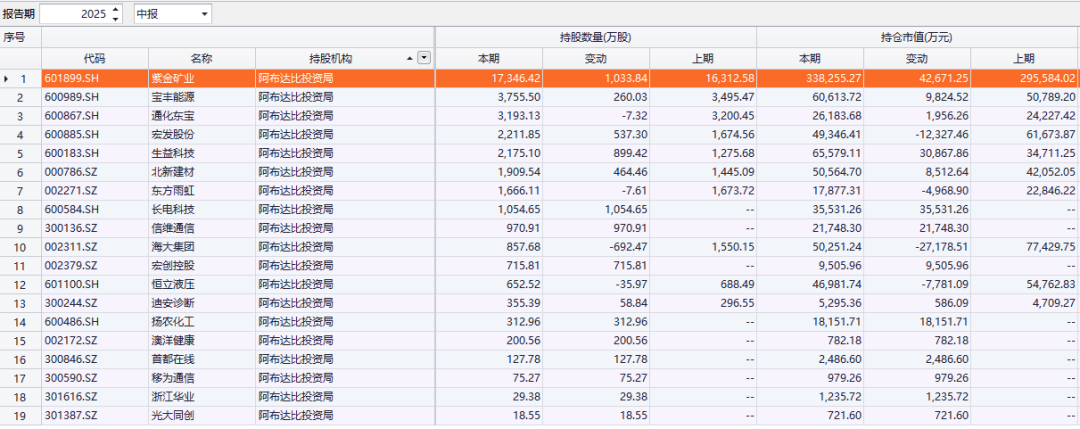 其中,阿布达比投资局对紫金矿业、宝丰能源、通化东宝、宏发股份、生益科技等8只股票的持股数量均超过1000万股。今年二季度,阿布达比投资局新进了长电科技、信维通信、宏创控股、扬农化工等9只股票前十大流通股股东名单。