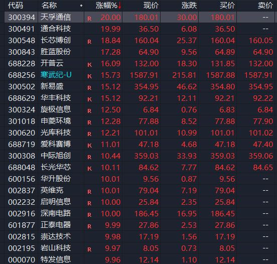 8月28日盘中,数据中心板块V形大反弹。截至收盘,天孚通信、英维克、启明信息、深南电路等20多只相关概念股涨停或涨超10%。其中,寒武纪大涨近16%,股价再创历史新高,总市值突破6600亿元,凸显市场对数据基础设施与AI算力的强烈预期。