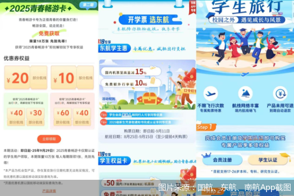 北京商报记者查阅众多航司官网或App发现,以国航、东航、南航为首的国内航司相继推出了学生出行优惠,其优惠方式主要集中在权益卡、优惠券和免费行李额三方面,优惠持续时间集中在8月下旬至9月中下旬。以国航为例,在国航App的“2025学生专区”,北京商报记者看到,国航的2025级新生福利包括了20kg额外行李额、2025青春畅游卡、选座免费礼券、特惠升舱、留学生“行李+1”以及票价立减优惠。根据2025青春畅游卡规则,学生完成身份认证并领取该卡后,可直接获得10元、20元指定舱位机票优惠券;学生使用青春畅游卡出游1次或2次时,能够分别获得指定舱位30—60元的机票优惠券。东航相关负责人表示,东航于近期全面升级“开学季”系列服务产品,推出机票直减优惠、赠送免费行李额度、“开学季惊喜盲盒”、免费“学生权益卡”等举措。在领取上述福利前,学生旅客需注册成为东航“东方万里行”会员并通过活动专区完成身份认证;刚被录取的新生可凭借录取通知书完成认证以享受同等福利。南航则是推出了“学生旅行”产品。根据其App的产品规则,完成学生认证后,旅客可购买南航“学生旅行”产品,在有效期内享受不限次数的境内经济舱特惠购票权益。此外,四川航空、山东航空等也相继推出机票立减券等学生优惠。