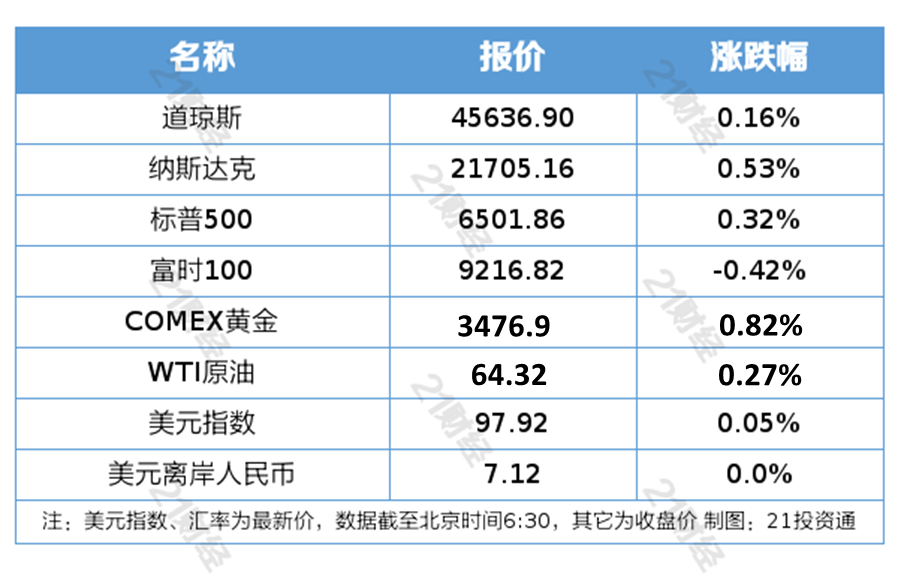 1、美国三大股指收涨,道指涨0.16%,标普500指数涨0.32%创历史新高,纳指涨0.53%。赛富时、思科领涨道指。