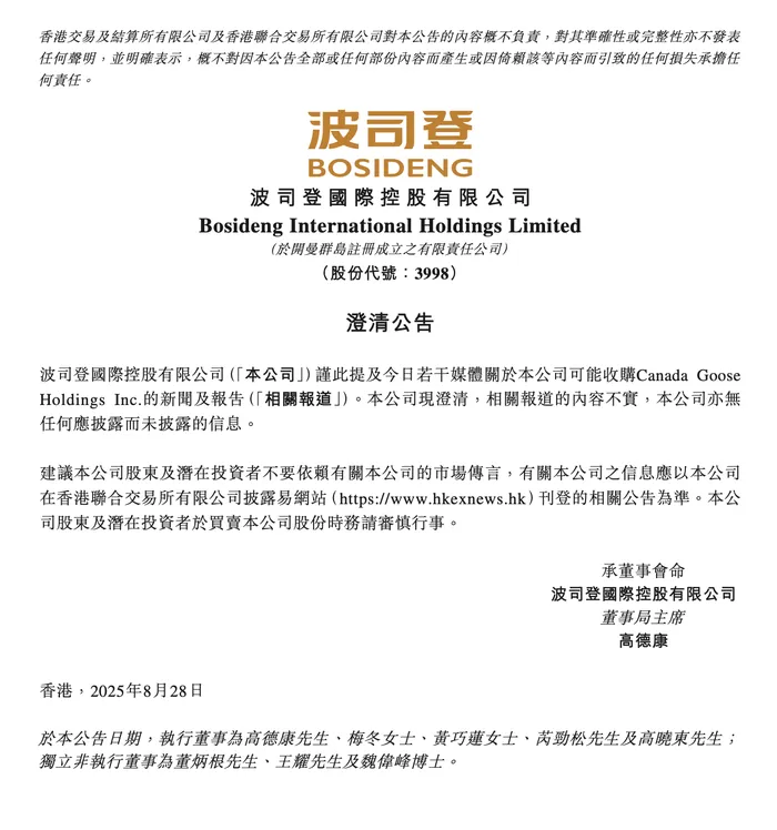 财联社8月29日讯,波司登在港交所发布公告,澄清关于收购Canada Goose Holdings Inc.的传闻不实,公司无收购计划,也无应披露未披露信息。