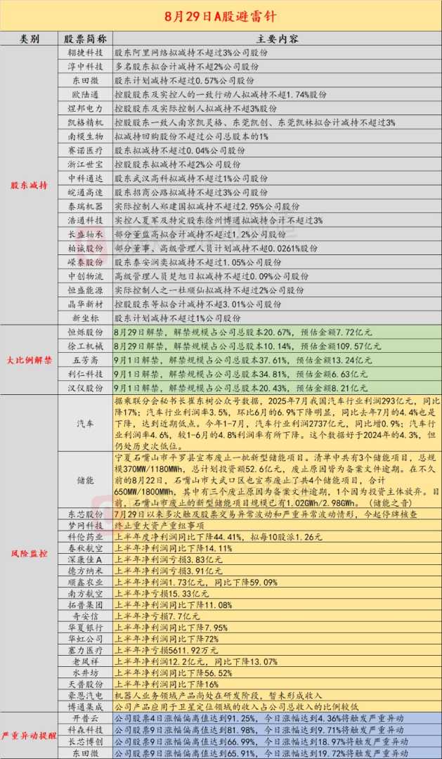 财联社8月29日投资避雷针,聚焦国内经济信息,汽车行业7月利润率创近五年新低,宁夏废止多个储能项目;公司方面,东芯股份停牌核查,多家企业股东拟减持;海外市场,欧洲智能手机出货量降9%,欧元区信心下滑,复苏前景不明朗。