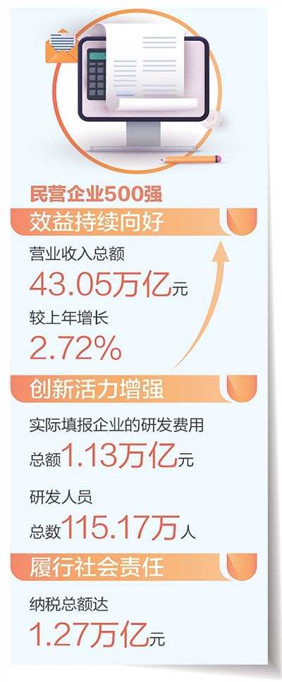 面对外部压力加大、内部困难增多的复杂严峻形势,民营企业500强坚定不移走高质量发展之路,专心致志做强做优做大企业,整体保持稳中有进、稳中向好的态势,企业效益和核心竞争力进一步增强。