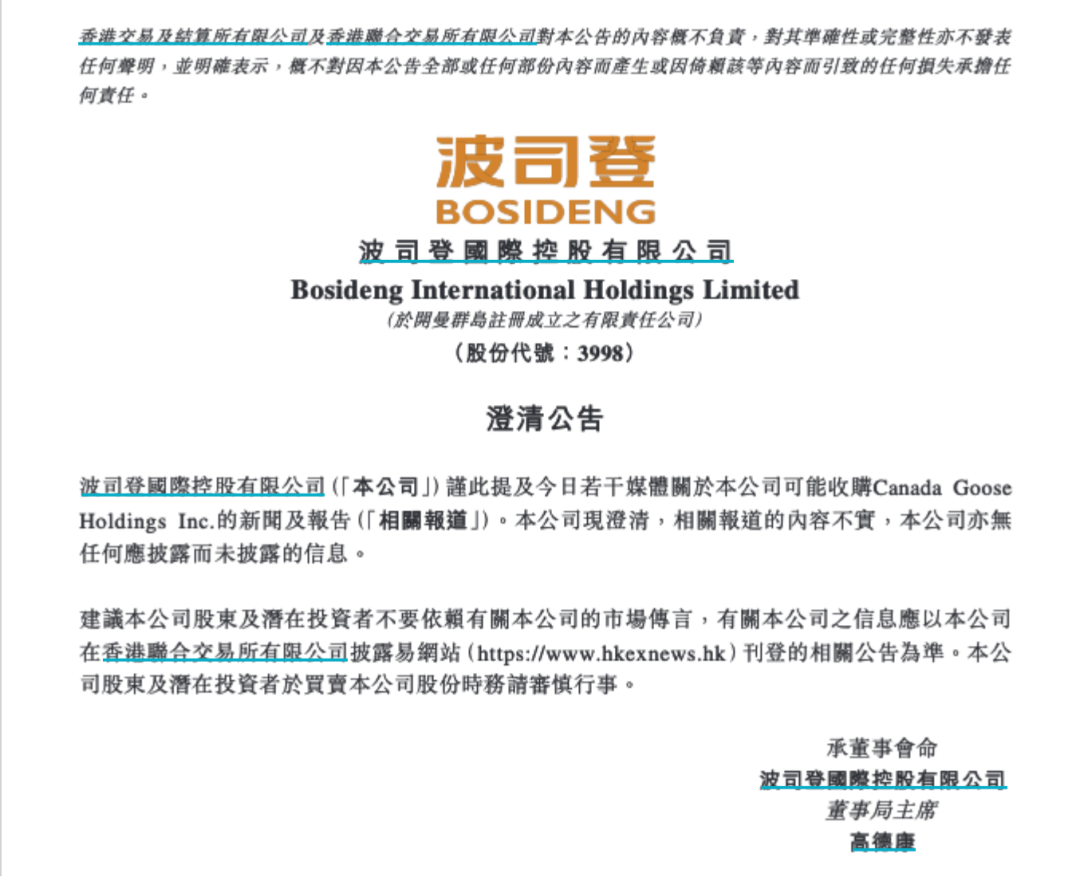 安踏波司登双双澄清,加拿大鹅收购传闻引市场波动