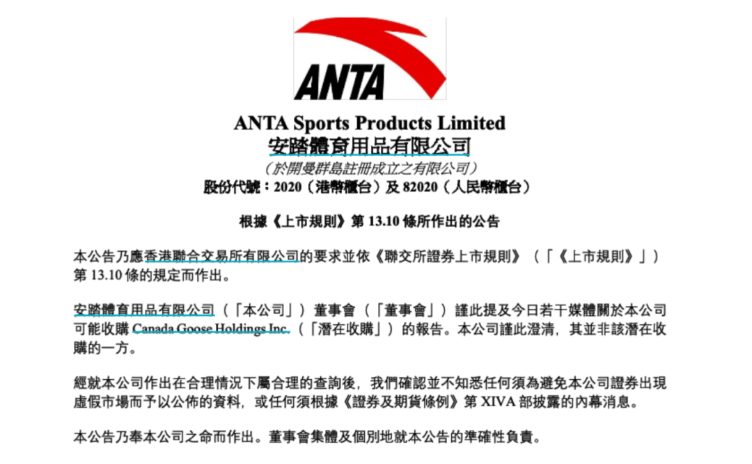 此前,8月28日,安踏(02020.HK)亦发布公告表示,公司并非Canada Goose Holdings Inc.收购事项的潜在收购一方,进一步澄清了市场猜测。