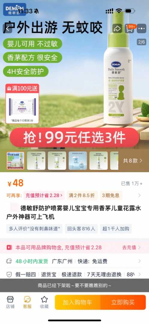 8月28日,记者发现,在某网购平台“德敏舒旗舰店”销售的德敏舒婴儿香茅防护喷雾显示“商品已经下架”。