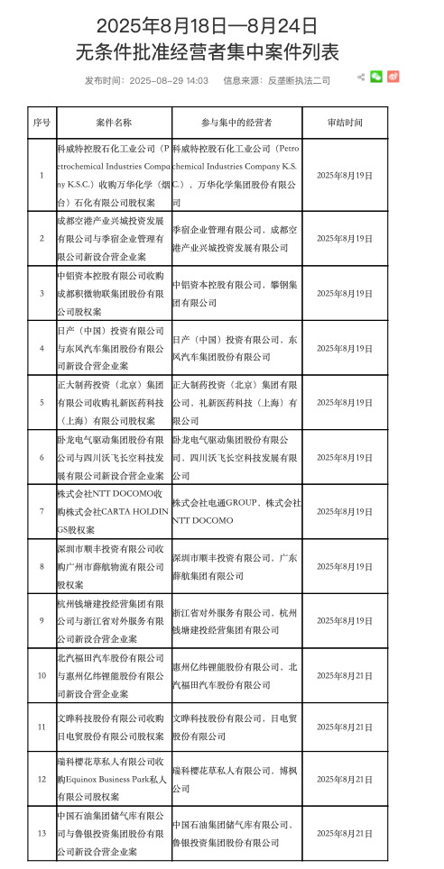市场监管总局发布2025年8月18日—8月24日无条件批准经营者集中案件列表,涵盖科威特控股石化收购万华化学股权案、日产中国与东风汽车新设合营企业案等重大交易。