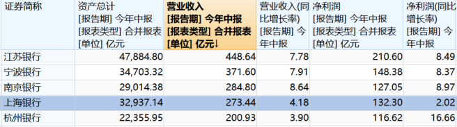 据财报,2025年上半年,上海银行实现营收273.44亿元,同比增长4.18%;净利润132.3亿元,同比增长2.02%。据wind数据,2025年上半年,在长三角5家头部城商行中,上海银行营收被南京银行超越,排名降至第四,位于江苏银行、宁波银行、南京银行之后,高于杭州银行;净利润保持第三,但净利润增速在5家城商行中垫底,另外4家城商行增速均超8%,银行营收格局变化明显。