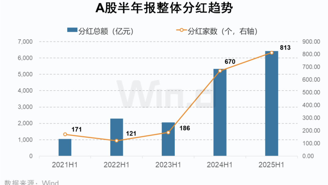 据Wind数据,2025年半年报分红延续高增长,813家公司披露分红预案,总额达6428亿元,同比增长20.7%,分红家数增加143家,刷新中期分红水平。