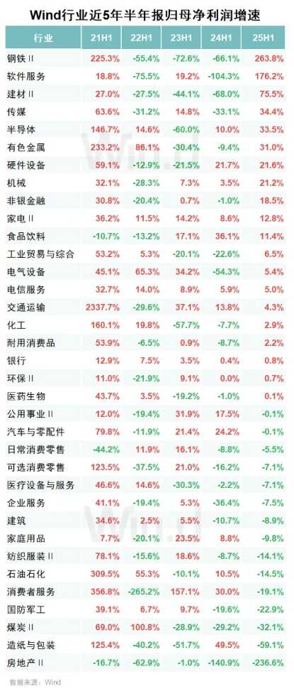 据Wind数据,2025上半年半导体、硬件设备行业营收增速领先,分别为19.88%、17.08%。净利润方面,钢铁、软件与服务、建材增速最快,分别为263.77%、176.19%、75.49%,半导体等行业增速也较高。