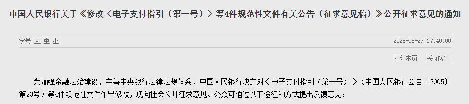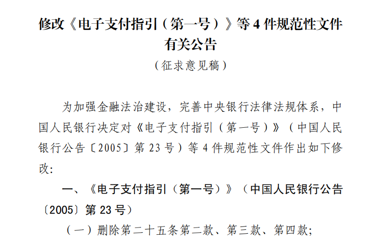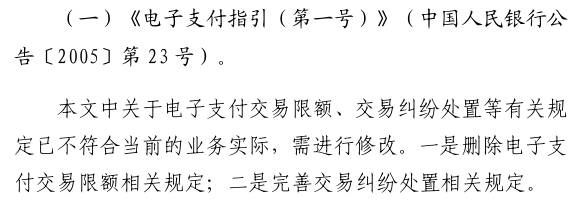 通知显示,为加强金融法治建设,完善中央银行法律法规体系,中国人民银行决定对《电子支付指引(第一号)》(中国人民银行公告〔2005〕第23号)等4件规范性文件作出修改,并向社会公开征求意见。看点一:删除电子支付交易限额相关规定根据中国人民银行《修改〈电子支付指引(第一号)〉等4件规范性文件有关公告(征求意见稿)》起草说明,《电子支付指引(第一号)》(中国人民银行公告〔2005〕第23号)中关于电子支付交易限额、交易纠纷处置等有关规定已不符合当前的业务实际,需进行修改。一是删除电子支付交易限额相关规定;二是完善交易纠纷处置相关规定。