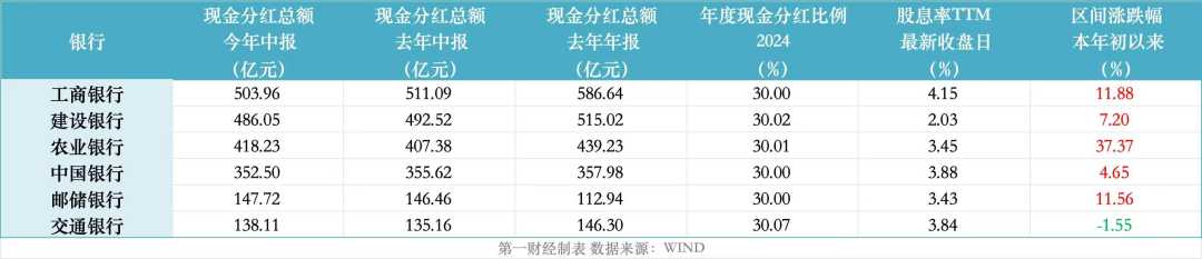29日,大行同步披露了今年的中期分红方案,六大行均按照上半年归母净利润的30%进行现金股息派发,合计分红金额达到2046.57亿元。去年,六大行中期分红总额约为2048.23亿元,全年合计分红金额约为4206亿元,分红比例稳定在30%,银行股息率吸引力持续增强。