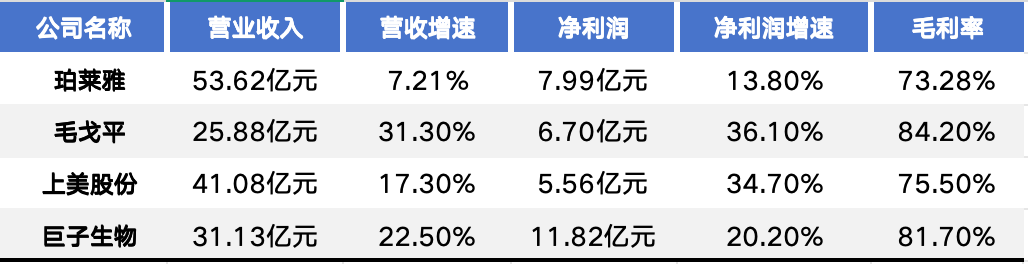 珀莱雅、毛戈平、上美股份等行业龙头持续领跑,但华熙生物、敷尔佳明显“掉队”;上海家化、丸美生物等第二梯队企业紧追,但同时面临效率和盈利的双重考验。