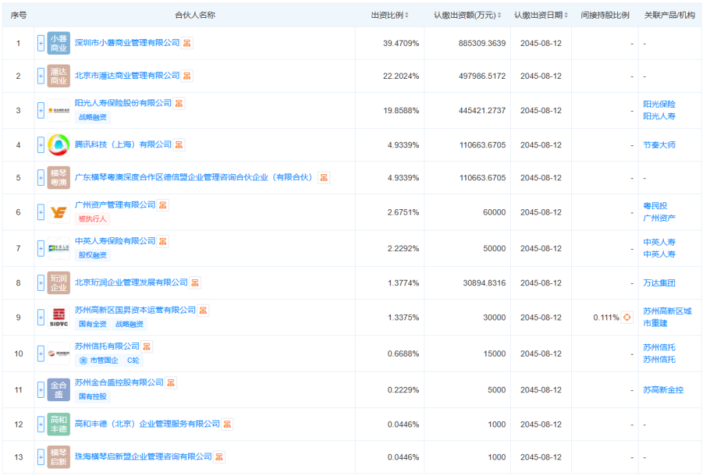 近期,该只基金已经组建完成。据天眼查披露,8月25日,苏州宽遇股权投资基金合伙企业注册成立,出资额约224.29亿元。这只基金由13家公司成立。其中,腾讯系企业合计认缴99.6亿元,占比最高,达到44.4%;京东旗下潘达商管出资47.8亿元,占比22.2%,此外,太盟、阳光人寿等机构共同完成剩余出资。