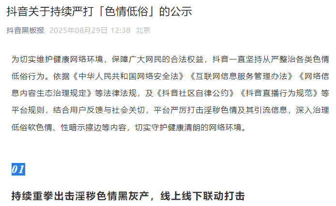 为切实维护健康网络环境,保障广大网民的合法权益,抖音一直坚持从严整治各类色情低俗行为。依据《中华人民共和国网络安全法》《互联网信息服务管理办法》《网络信息内容生态治理规定》等法律法规,及《抖音社区自律公约》《抖音直播行为规范》等平台规则,结合用户反馈与社会关切,平台严厉打击淫秽色情及其引流信息,深入治理低俗软色情、性暗示擦边等内容,切实守护健康清朗的网络环境,加强网络监管力度。