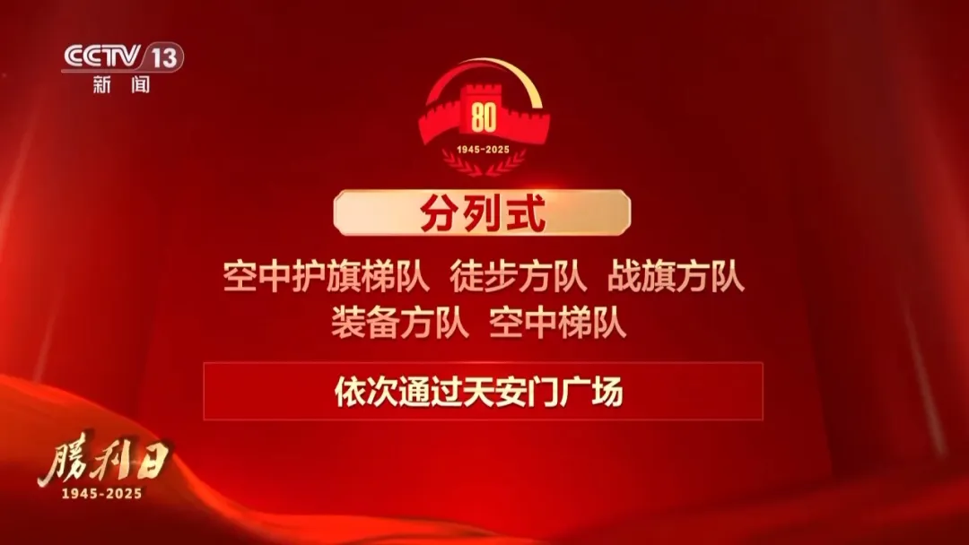 分列式环节,按空中护旗梯队、徒步方队、战旗方队、装备方队、空中梯队的顺序,依次通过天安门广场,展现我军风采。
