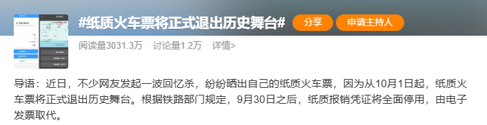 财联社9月1日讯,话题#纸质火车票将正式退出历史舞台#今日冲上热搜榜首,引发广泛关注。有网友称,没有“纸质票”记不住车次和座位号怎么办?也有网友担心,没有智能手机的老人怎么查看乘车信息?对此,中国铁路12306就相关问题作出回应,这一变化也标志着铁路报销进入电子发票时代。