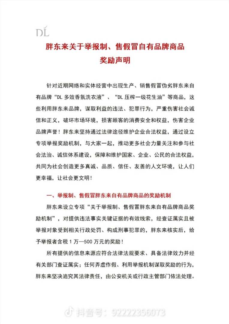 9月1日,胖东来发布举报制、售假冒自有品牌商品奖励声明,针对假冒“DL多效香氛洗衣液”等商品行为,拟设立专项奖励机制,对有效线索提供者给予1万-500万元奖励,并公布两种官方举报渠道。