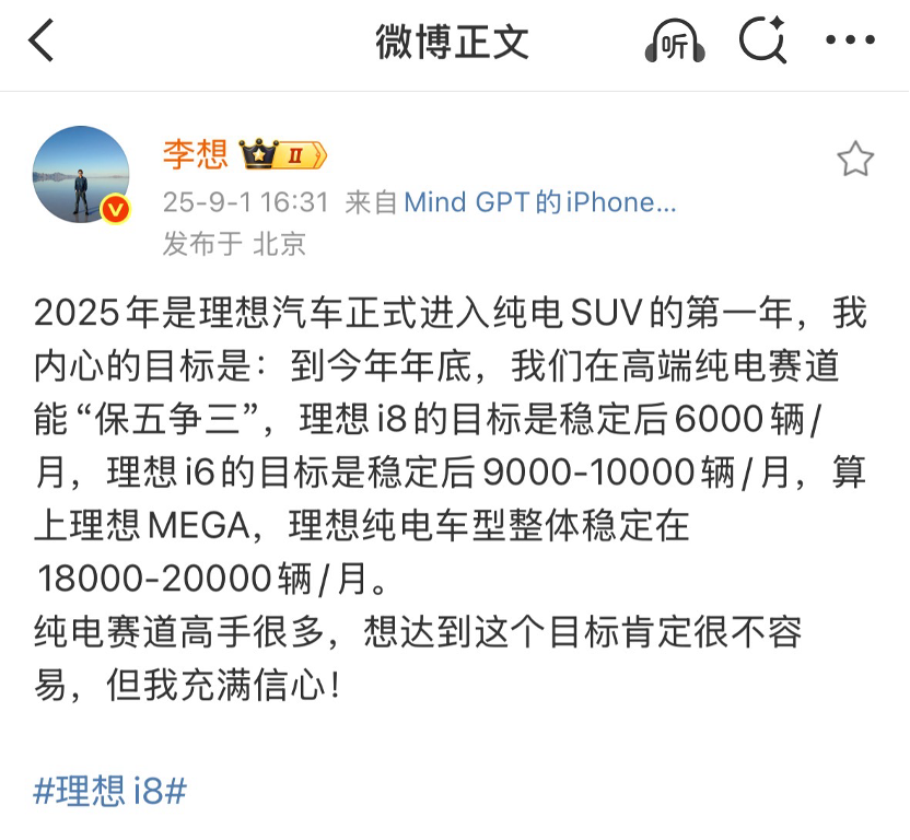 7月29日,理想汽车首款纯电SUV理想i8发布。但其纯电战略实施并不顺利,在理想i8发布一周后,理想汽车将原有三款配置调整为一款,并将售价统一为33.98万元,相比最初高配版降价3万元。理想i8于8月20日开启交付。理想汽车CEO李想9月1日发布微博称:“2025年是理想汽车正式进入纯电SUV的第一年,目标到今年年底,在高端纯电赛道能‘保五争三’,理想i8的目标是稳定后6000辆/月,理想i6的目标是稳定后9000-10000辆/月,叠加理想MEGA,理想纯电车型整体稳定在18000-20000辆/月。”