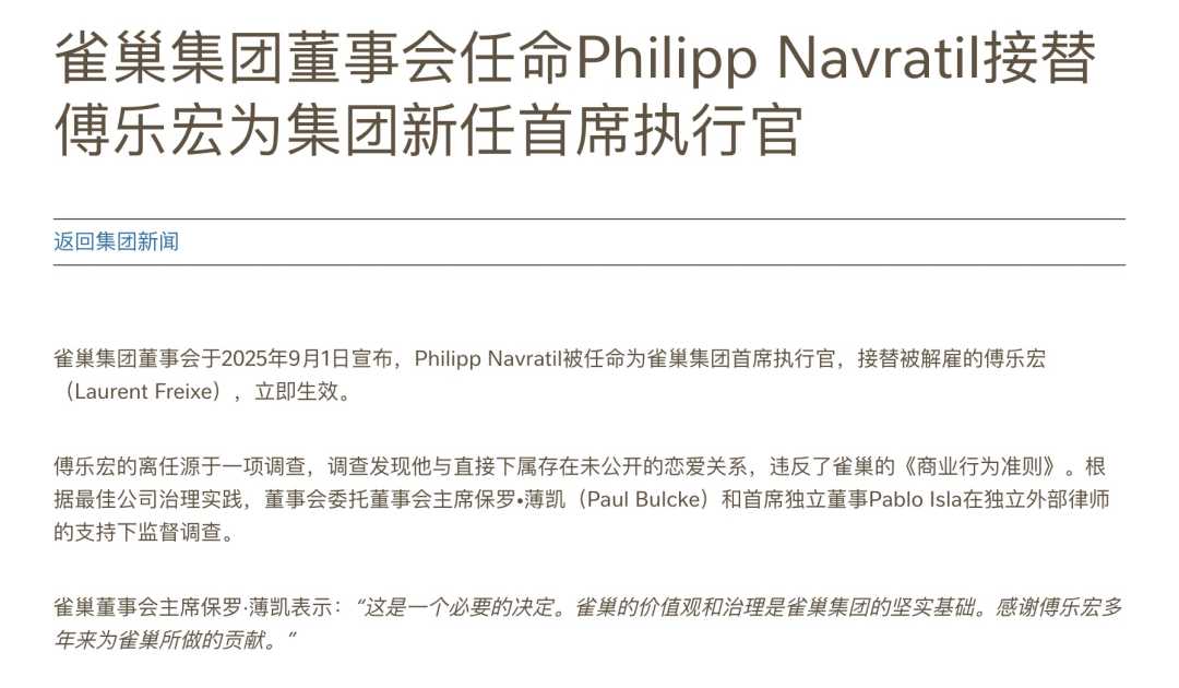 9月1日,雀巢集团宣布重大人事变动,公司CEO傅乐宏因违反公司准则被解雇,Philipp Navratil被任命为新任雀巢集团CEO。此次变动引发了广泛关注,与以往常见的“霸道总裁爱上我”剧情不同,雀巢CEO傅乐宏因与下属的“浪漫恋情”而丢了饭碗。