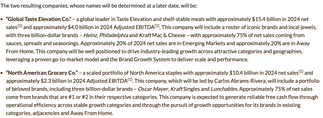 根据公告,两家新公司的名称尚未确定,将在后续公布。第一家公司(Global Taste Elevation Co)将专注于酱料、调味品和即食餐食,旗下包括亨氏番茄酱、卡夫通心粉奶酪等核心品牌。拆分前,卡夫亨氏这部分业务在2024年的销售额接近154亿美元,其中75%来自调味酱、涂抹酱与调味料销售,凸显调味品市场潜力。
