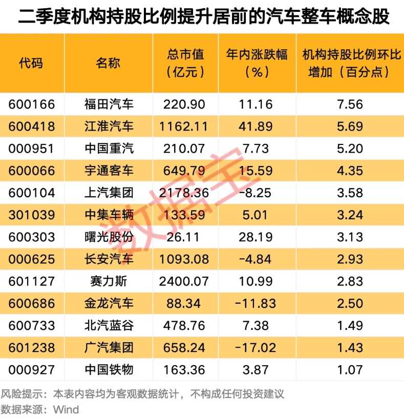 二季度机构加仓的汽车整车概念股出炉,汽车市场迎来新增长点。