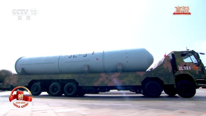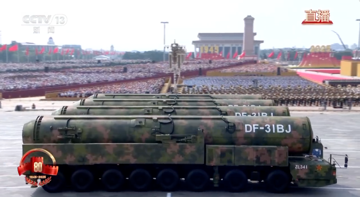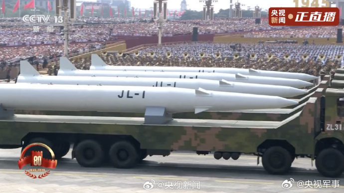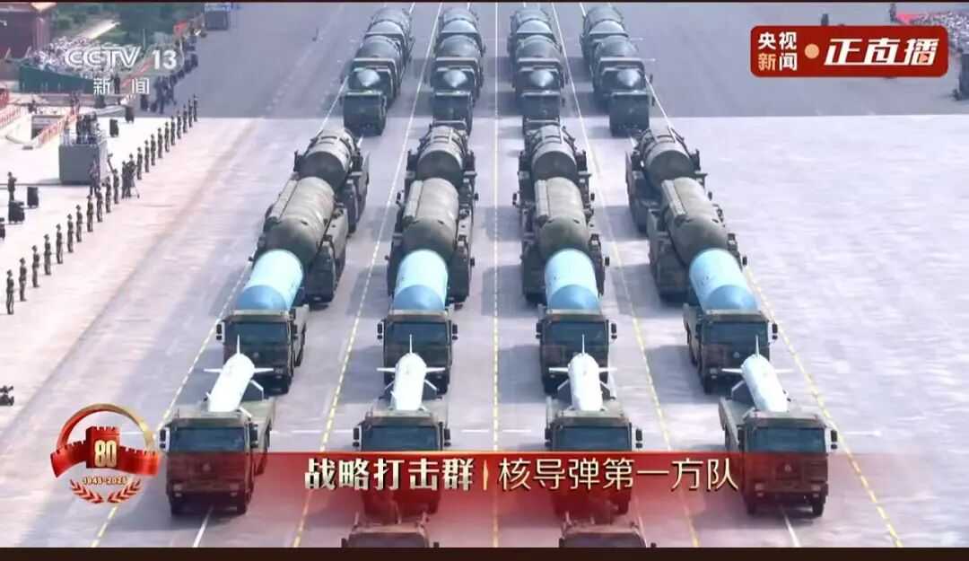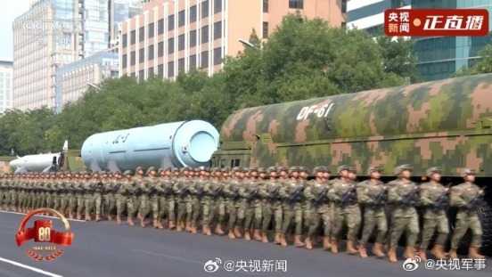 核导弹第一方队震撼登场。受阅的“惊雷-1”空基远程导弹、“巨浪-3”潜射洲际导弹、“东风-61”陆基洲际导弹、“东风-31”新型陆基洲际导弹,首次集中展示我军陆、海、空基“三位一体”战略核力量,是维护国家主权、捍卫民族尊严的战略“王牌”,彰显了中国在核武器领域的强大实力。