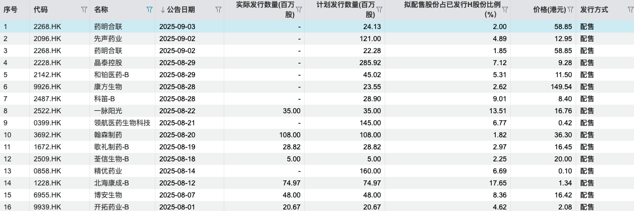 9月2日,药明合联(02268.HK)公告拟配售2300万股股份,筹资13.1亿港元,58.85港元的配售价较此前最后交易日收市价折让4%。同日,先声药业(02096.HK)也公告称,拟先旧后新配售1.21亿股股份,净筹约15.535亿港元。配售价格也较前一个交易日收盘价折让约8.03%。而在此之前,科笛-B(02487.HK)、和铂医药-B(02142.HK)、歌礼制药-B(01672.HK)等药企也都均已发布配股公告。