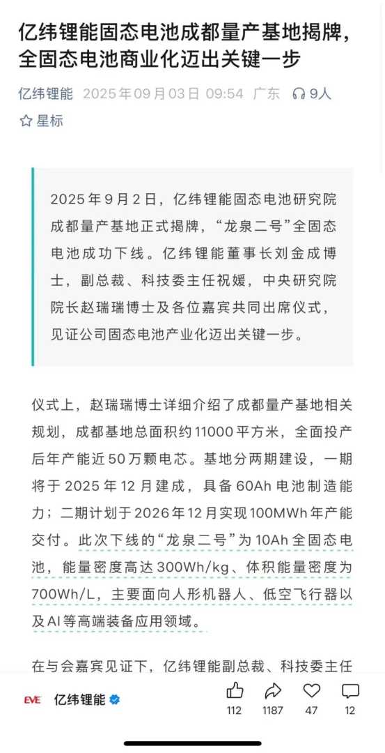 9月3日,亿纬锂能官方公众号发文称,9月2日公司固态电池研究院成都量产基地正式揭牌,“龙泉二号”全固态电池成功下线,固态电池产业化迈出关键一步。该基地总面积约11000平方米,全面投产后年产能近50万颗电芯,分两期建设:一期2025年12月建成,具备60Ah电池制造能力;二期2026年12月实现100MWh年产能交付,固态电池产能布局加速落地。