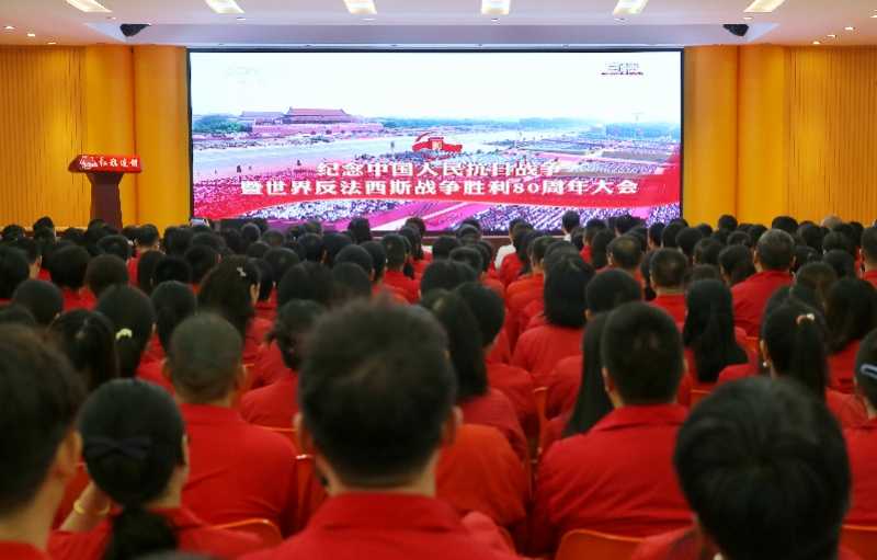 2025年9月3日纪念中国人民抗日战争胜利80周年大会举行,四川红旗连锁、长虹华丰等多企业组织员工收看直播,激发家国情怀与奋斗热情,展现科技报国决心。