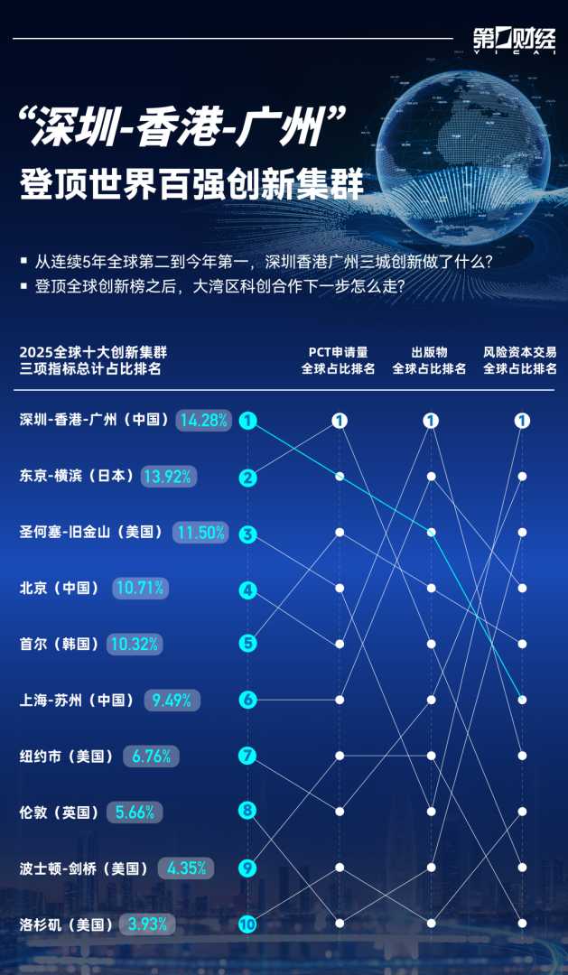 世界知识产权组织近日发布的《2025年全球创新指数》全球创新集群百强榜,使大湾区科创集群成为热点话题之一,科创发展备受关注。连续五年列日本“东京-横滨”集群之后,在今年的榜单中,“深圳—香港—广州”创新集群占据了榜首,彰显了大湾区创新实力。在创新强度排名方面,该集群位居第45。