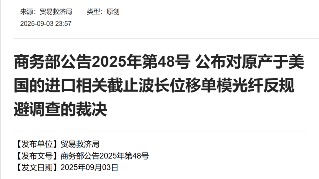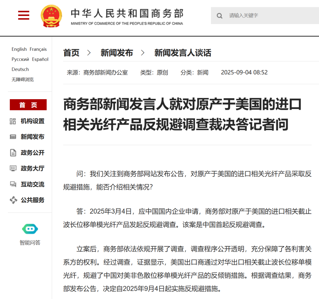 商务部裁定美国光纤生产商出口相关光纤规避反倾销,自2025年9月4日起实施反规避措施,对康宁等公司征收反倾销税,期限至2028年4月21日。