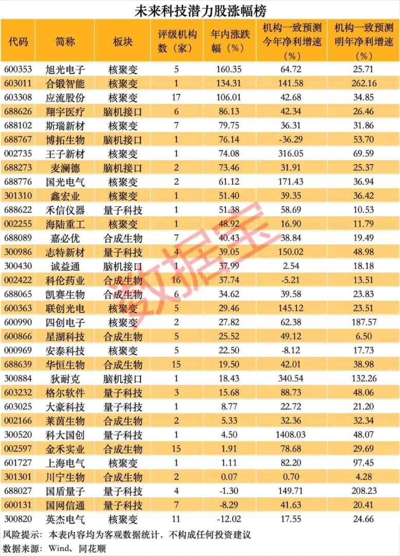 根据机构研报,有33股涉及脑机接口、核聚变、生物合成、量子科技等未来科技题材,这些领域或将成为下一波投资热点。