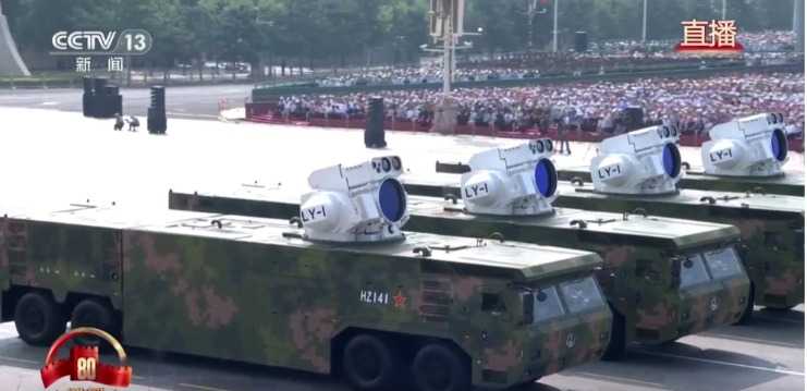 载有激光武器的战车出现在舰载防空武器方队中。据央视截图