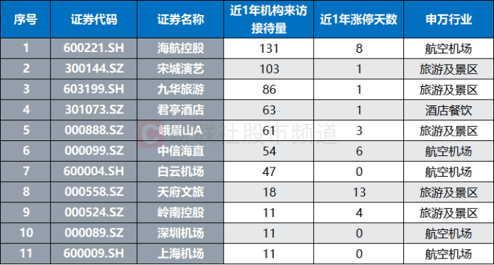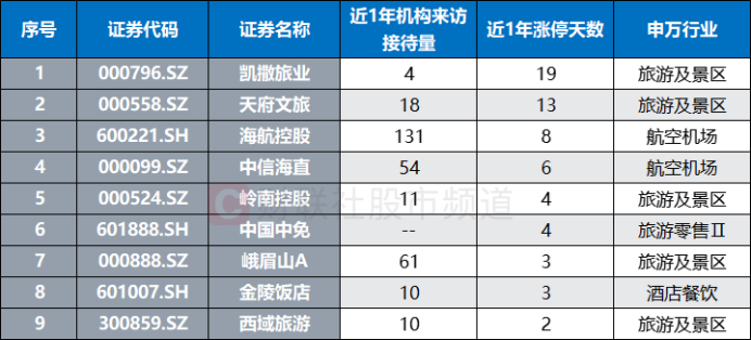 对于可关注标的方面,筛选旅游、酒店、机场及免税概念股,海航控股、宋城演艺2股近1年机构调研量双双超100次,九华旅游、君亭酒店、峨眉山A、中信海直、白云机场、天府文旅等股也获机构重点关注。若以股价活跃度统计,凯撒旅业、天府文旅近1年涨停次数超10次,海航控股、中信海直、岭南控股、中国中免等股涨停次数也居前,旅游板块(旅游板块投资)值得投资者密切关注。