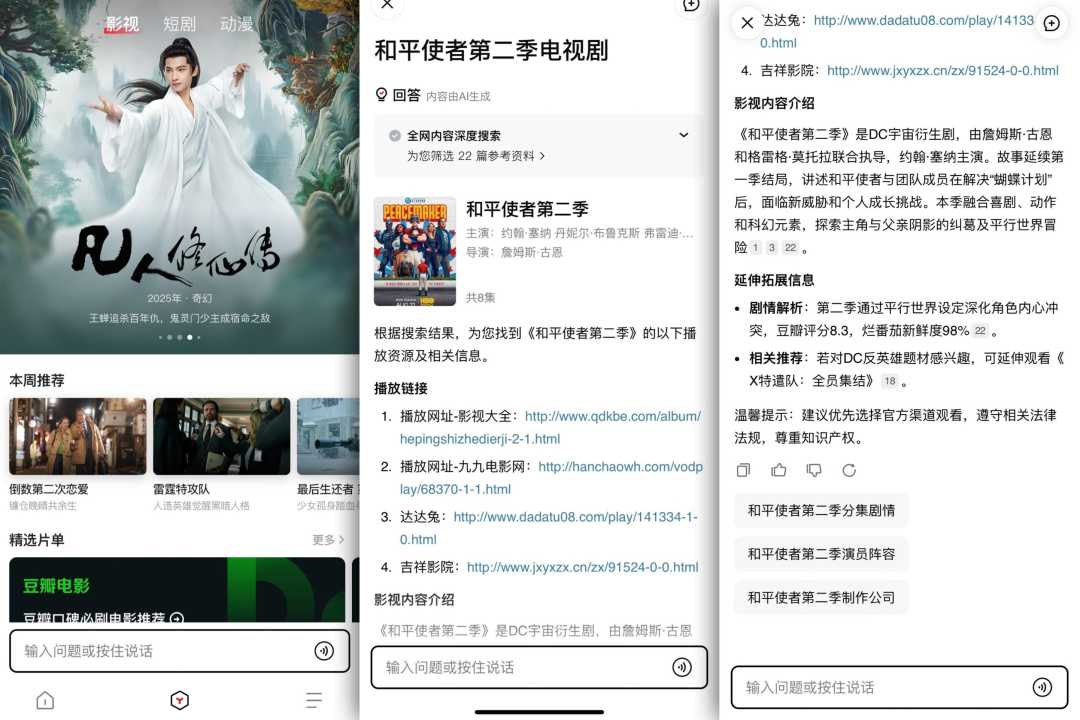 值得一提的是,梯子AI不仅提供智能问答服务,还专门设置了追剧板块,涵盖影视、短剧和动漫三大类别。用户点击感兴趣的视频内容后,梯子AI会自动生成包括作品介绍、延伸资讯,甚至提供可免费观看的网站链接等相关信息。