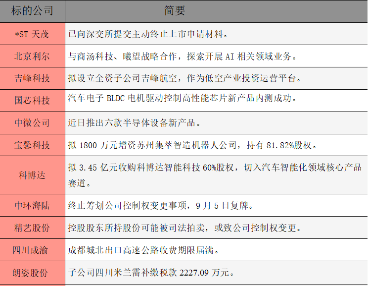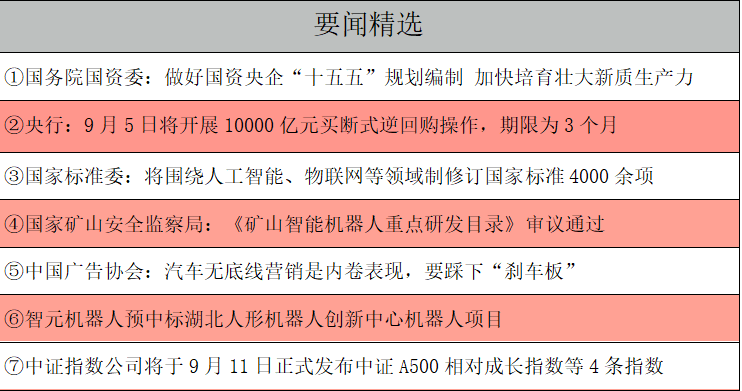 【摘要】国办印发释放体育消费潜力“20条”,推动体育产业高质量发展;电子信息制造业稳增长行动方案发布,聚焦北斗与人工智能融合;国务院国资委:做好国资央企“十五五”规划编制,加快培育壮大新质生产力;央行:9月5日将开展10000亿元买断式逆回购操作,期限为3个月;中国广告协会:汽车无底线营销是内卷表现,要踩下“刹车板”;智元机器人预中标湖北人形机器人创新中心机器人项目;美股三大指数收涨,纳指涨近1%。