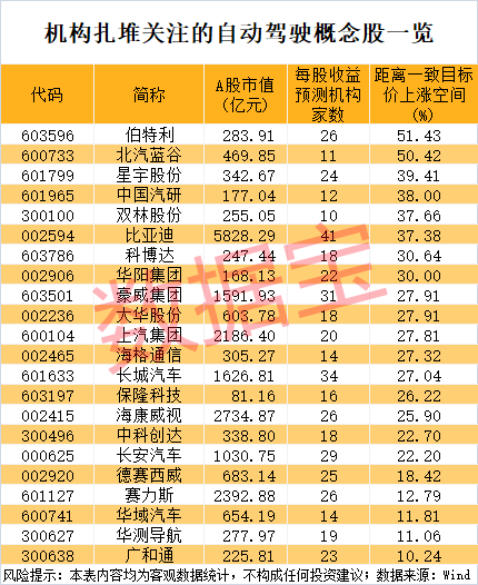 从机构关注度方面来看,获得券商机构“积极型”评级(含买入、增持、强烈推荐等)家数在10家及以上的自动驾驶概念股有34只。机构青睐程度居前的是比亚迪、长城汽车、豪威集团、拓普集团、长安汽车。以最新收盘价与机构一致预测目标价相比,22股上涨空间超过10%。其中伯特利上涨空间51.43%排在首位;今年上半年,公司实现净利润5.22亿元,同比增长14.19%。西部证券研报认为,2025年上半年,伯特利新增卡钳机加、电动助力转向、轻量化铸造等多项产能,全面夯实产能根基,看好公司在线控底盘领域及机器人领域的快速拓展。
