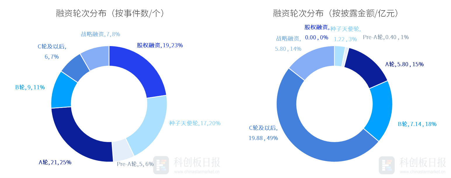 作为对比,本周AI应用、创新药、半导体设备二级市场表现稳健。从投资轮次来看,A轮融资事件数最多,发生21起,占比约25%;其次是种子天使轮,发生17起,占比约20%。C轮及以后披露的融资总额最高,约19.88亿元,显示出中后期项目的融资能力较强。