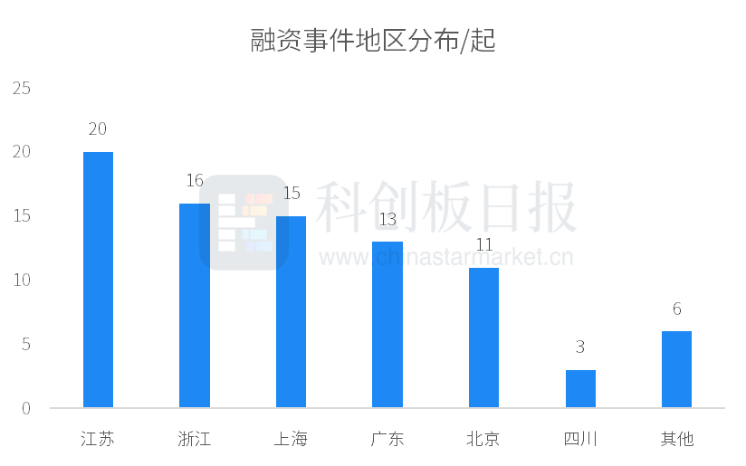 从地区来看,江苏、浙江、上海、广东、北京等地公司较受青睐,融资事件数均在10起以上。江苏以20起融资活跃度继续领先,上海有15家公司获投,居首位。北京紧随其后,有11家公司获投,区域投融资市场活跃。
